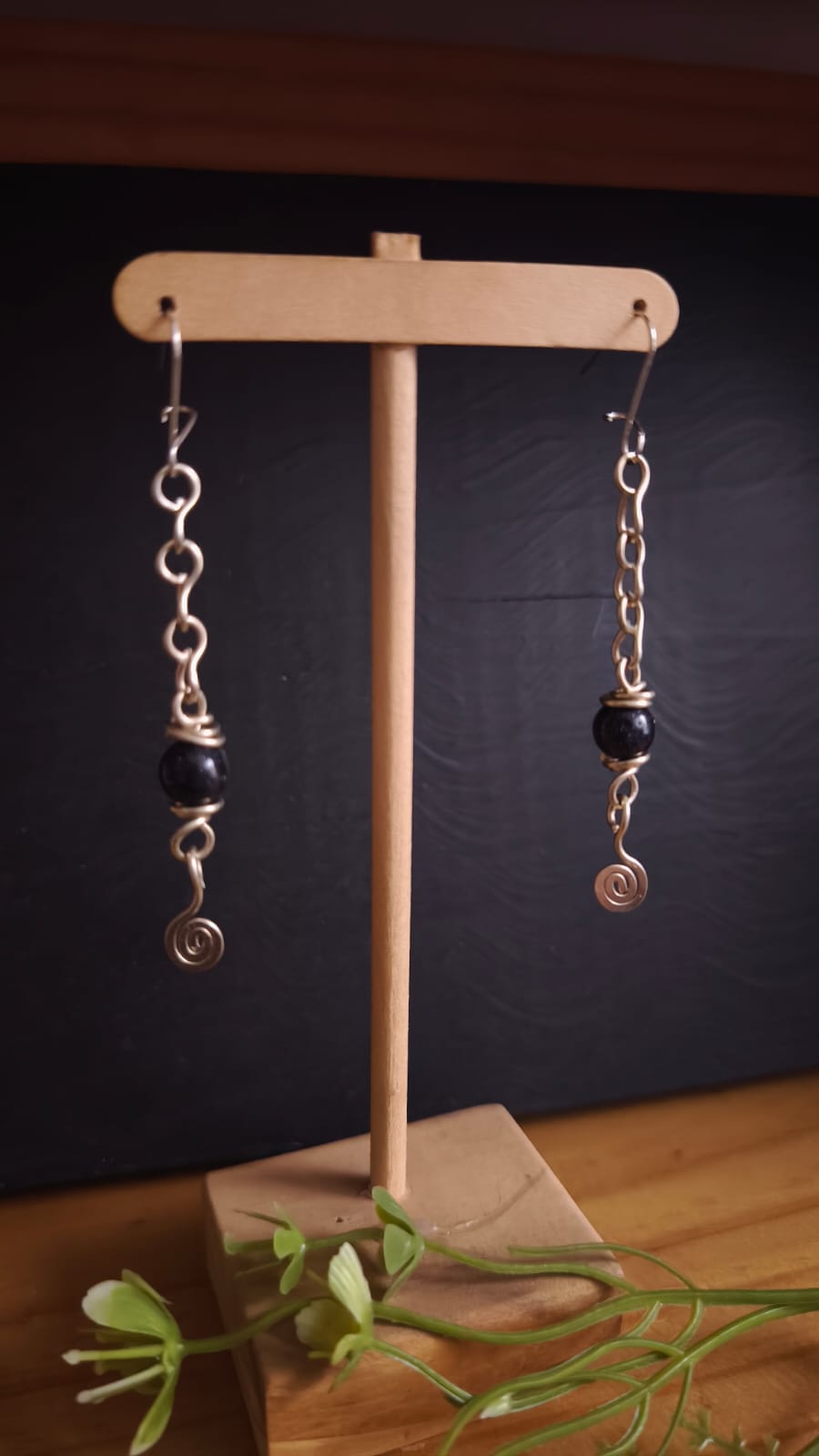 Eleva tu estilo con estos sofisticados aros de diseño alargado que evocan la magia del cosmos. La pieza central es una deslumbrante piedra «lluvia de estrellas», conocida por sus profundos tonos oscuros y destellos internos que imitan una galaxia en miniatura. Esta gema se encuentra suspendida de una delicada cadena de eslabones forjados a mano, que fluye con gracia hasta terminar en una pequeña espiral artesanal, aportando un movimiento ligero y elegante.