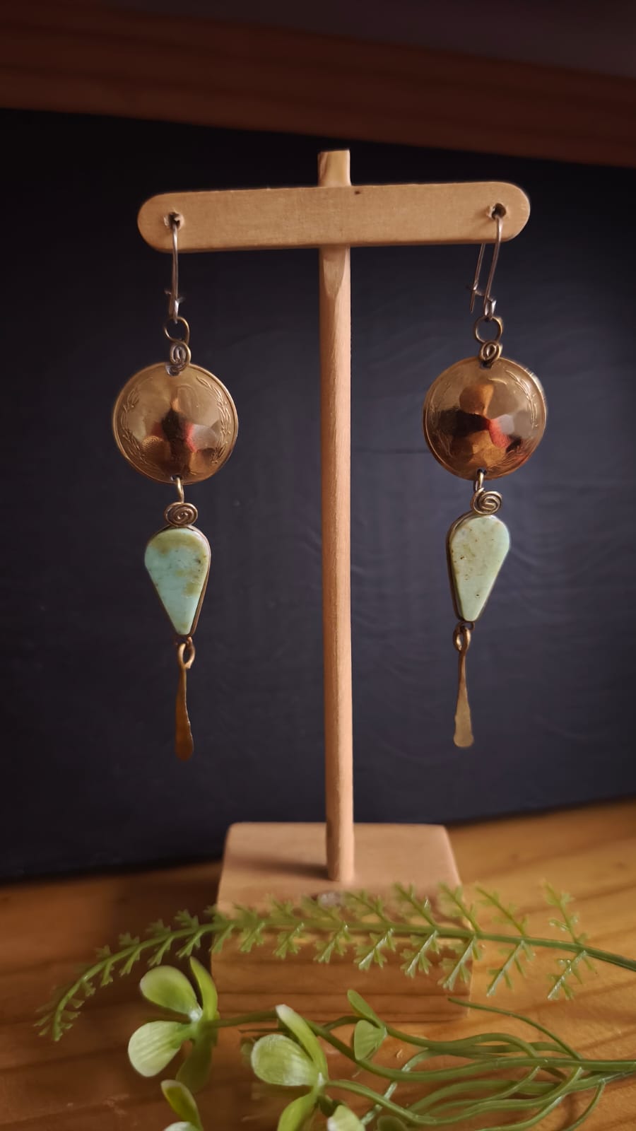 Estos aros artesanales están creados a partir de monedas antiguas de 10 pesos, transformadas en delicados discos de bronce que conservan la huella del tiempo y la historia en cada textura. La combinación con crisoprasa natural, de tonos suaves y frescos, aporta equilibrio y un contraste elegante que ilumina el rostro sin exceso.
