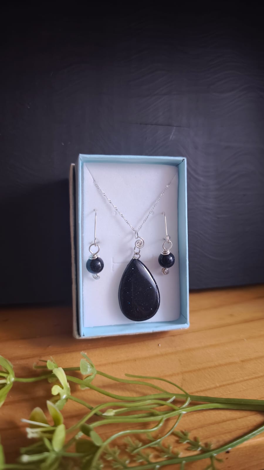 Lleva contigo la magia del cosmos con el conjunto «Destello Estelar», una pieza de joyería en plata de ley que destaca por su elegancia y misterio. Este set presenta como protagonista la piedra lluvia de estrellas, reconocida por su profundo tono azul noche y sus infinitos destellos brillantes que imitan una galaxia en miniatura. El conjunto incluye un dije principal en forma de lágrima pulida, suspendido de una fina cadena de plata de 50 centímetros, y un par de aros a juego que completan este diseño místico y sofisticado.