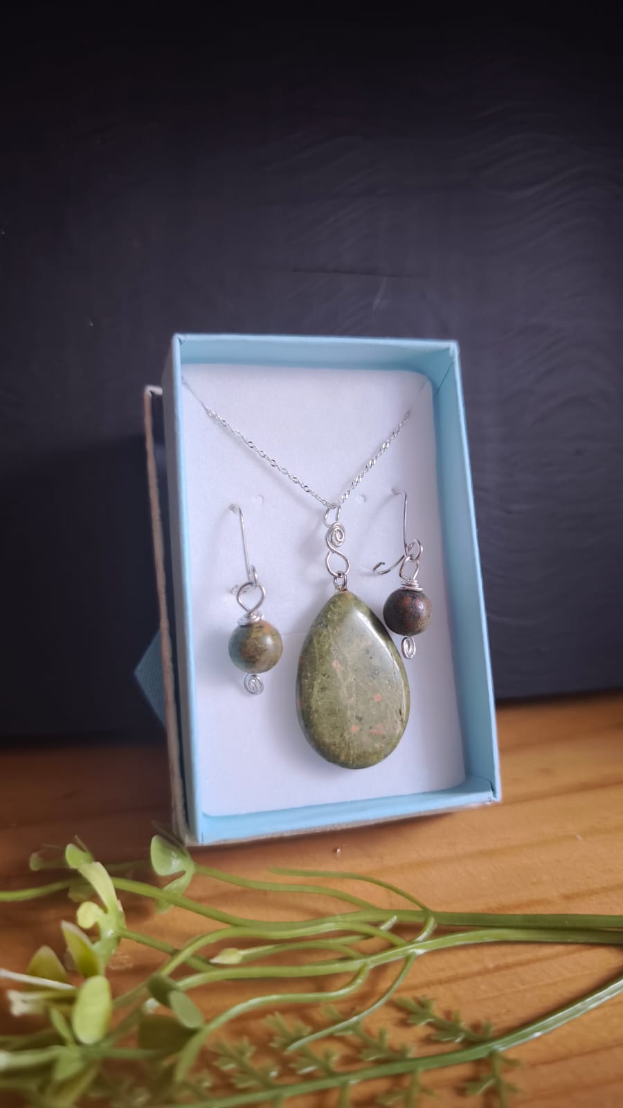 Cada detalle ha sido cuidadosamente trabajado a mano, desde los ganchos hipoalergénicos hasta los acabados en espiral que coronan las gemas. Este conjunto no solo es una joya de alta calidad, sino también un regalo significativo, ya que la unakita es conocida por fomentar la calma y el crecimiento personal. Se entrega en una hermosa cajita de regalo, lista para sorprender a esa persona especial o para darte ese gusto que mereces con una pieza de plata auténtica y duradera.