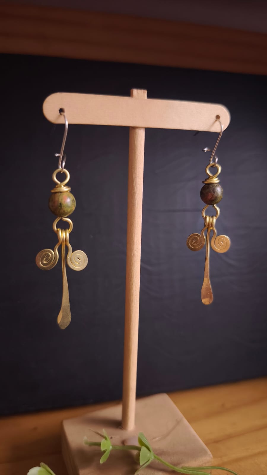 Estos delicados aros modelo «Unakita» son el equilibrio perfecto entre la sencillez y el detalle artesanal. Destacan por su piedra central de unakita, conocida por su hermosa mezcla natural de tonos verdes y rosados, que cuelga elegantemente de un diseño de espirales simétricas hechas a mano. Al ser piezas pequeñas y livianas, se convierten en la opción ideal para el uso diario, aportando un toque sutil de color y estilo étnico sin sacrificar la comodidad en ningún momento.