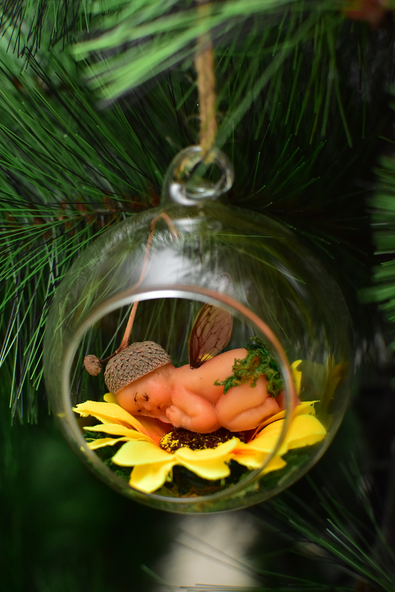 Descubre la magia de los bosques encantados con esta esfera artesanal de cristal, de 7 cm de diámetro, que guarda en su interior un hada bebé durmiente, modelada a mano con cerámica en frío.